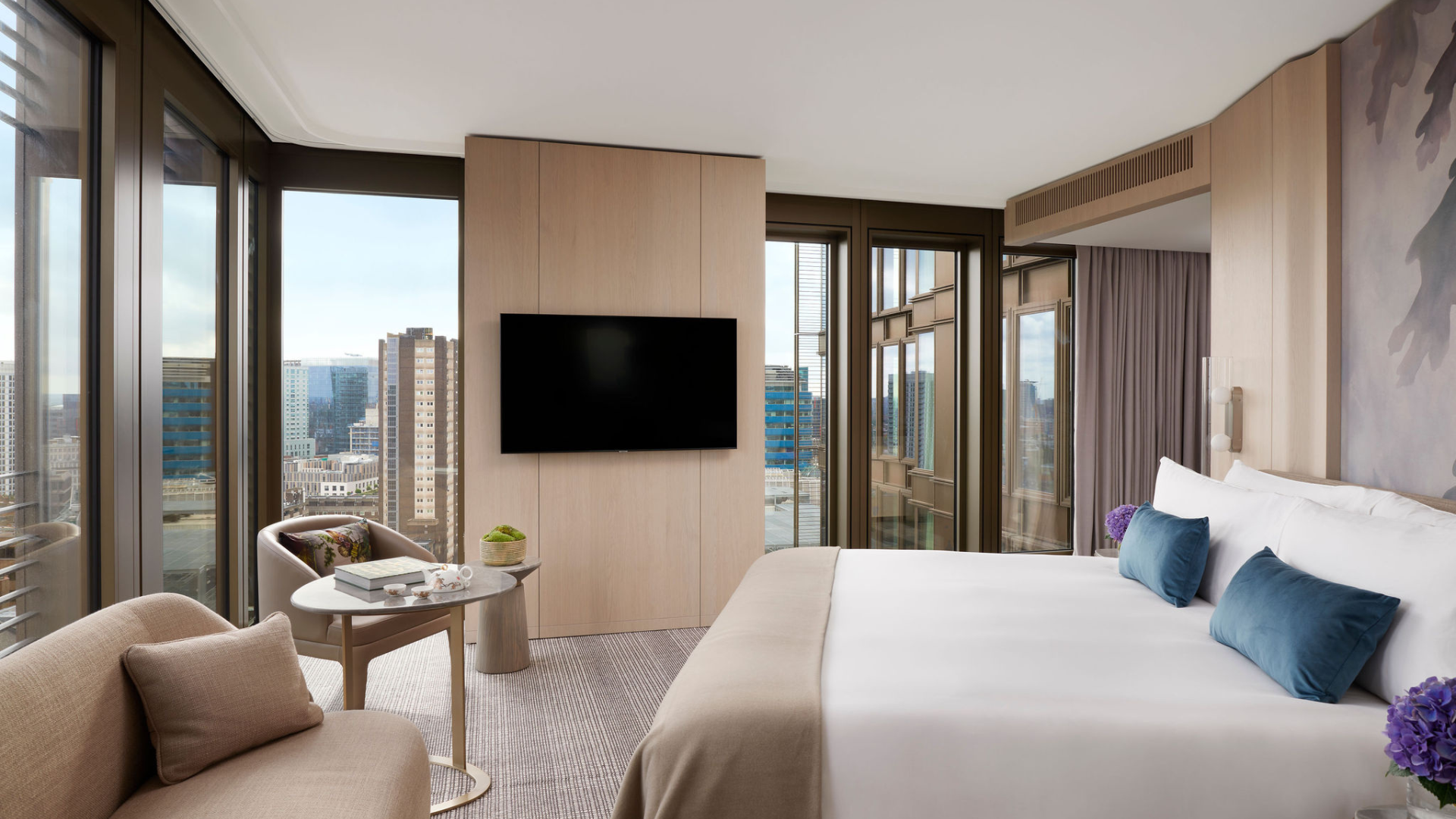 For those seeking a chic business hotel with one of the best executive rooms in London, our Executive Room exudes sophistication. Boasting a contemporary design with a neutral color scheme and natural wood details, this spacious living area includes floor-to-ceiling windows that flood the room with natural light and offer stunning city views.