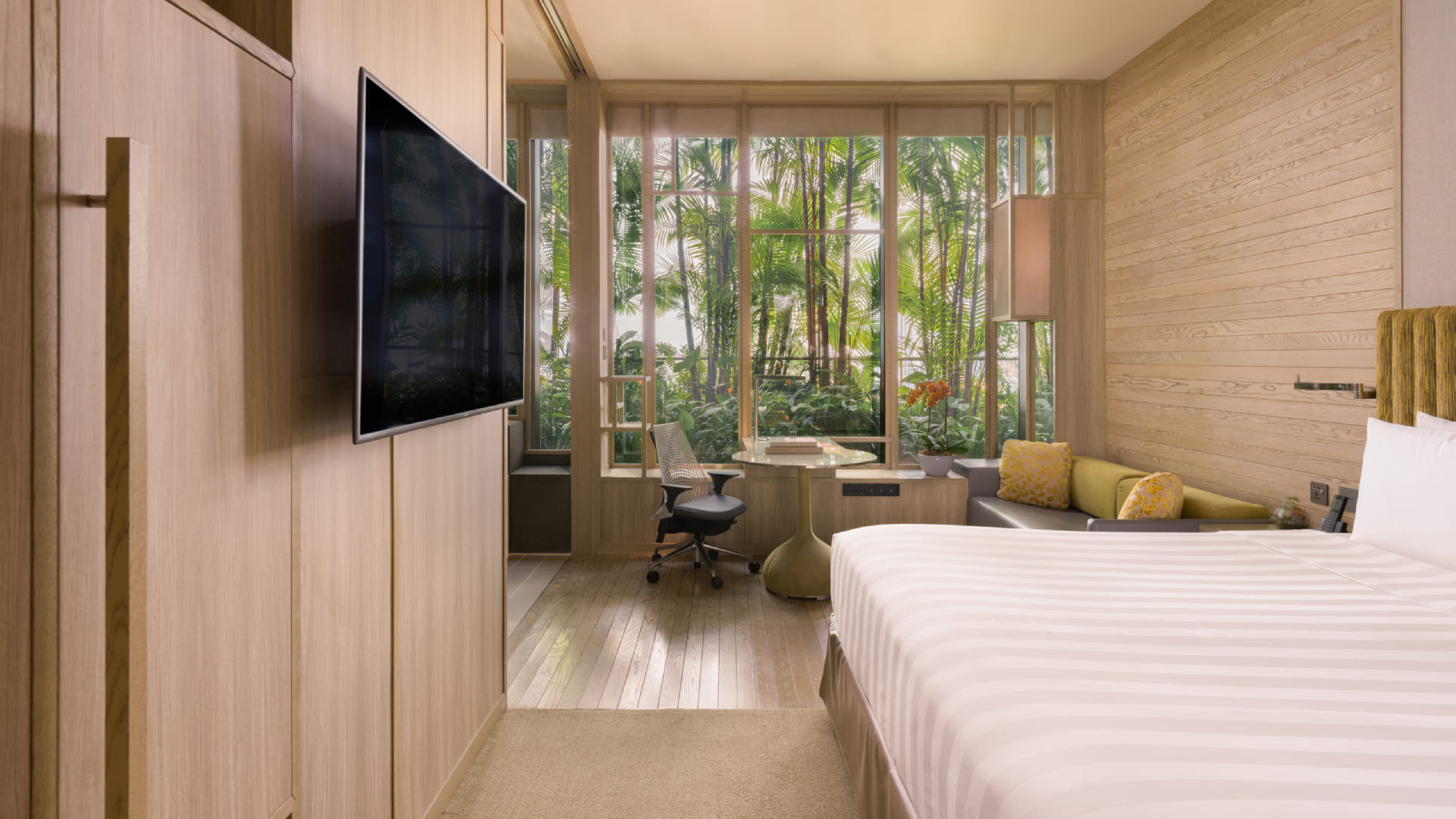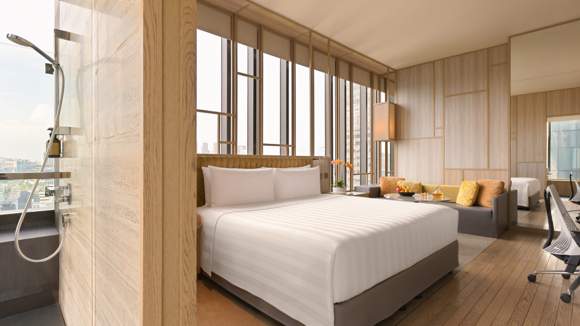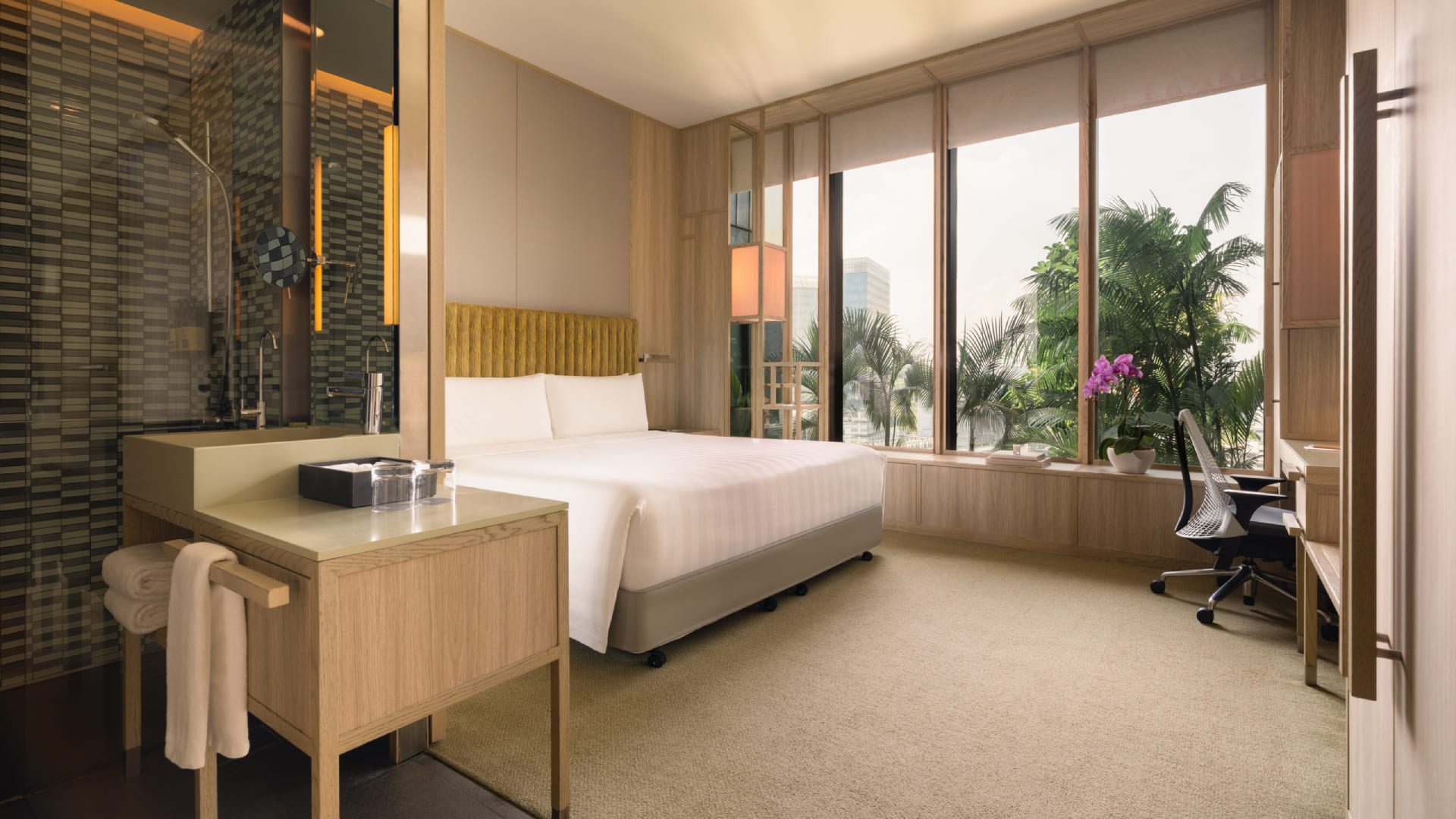 酒店客房与套房的设计灵感源于自然,采光充足,旨在为您打造一处静谧舒适的休憩之所。在舒适的客房内,您可以欣赏滨海湾和克拉码头的壮丽景色。房间采用天然木质装饰、落地窗、可生物降解的用品和高级过滤饮水机,减少一次性塑料瓶的使用,打造环保奢华的生活方式。