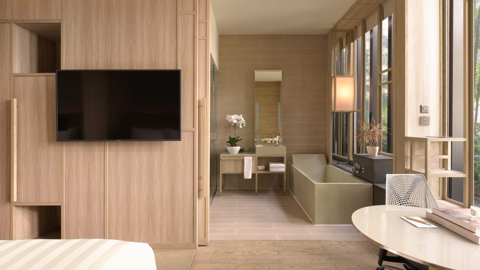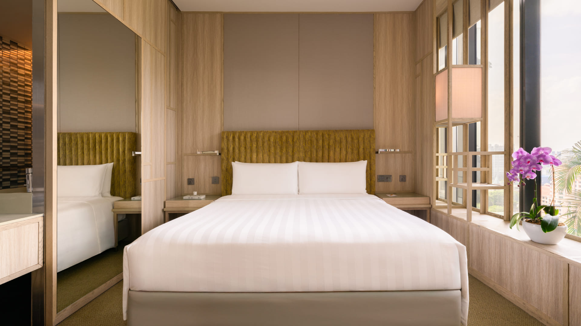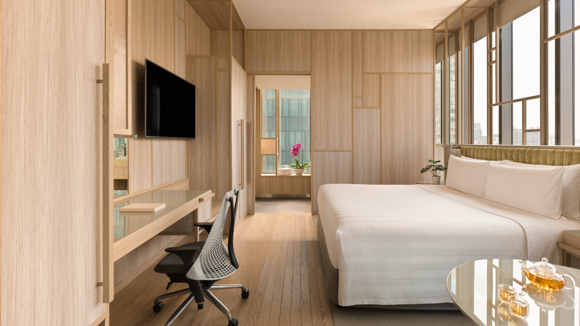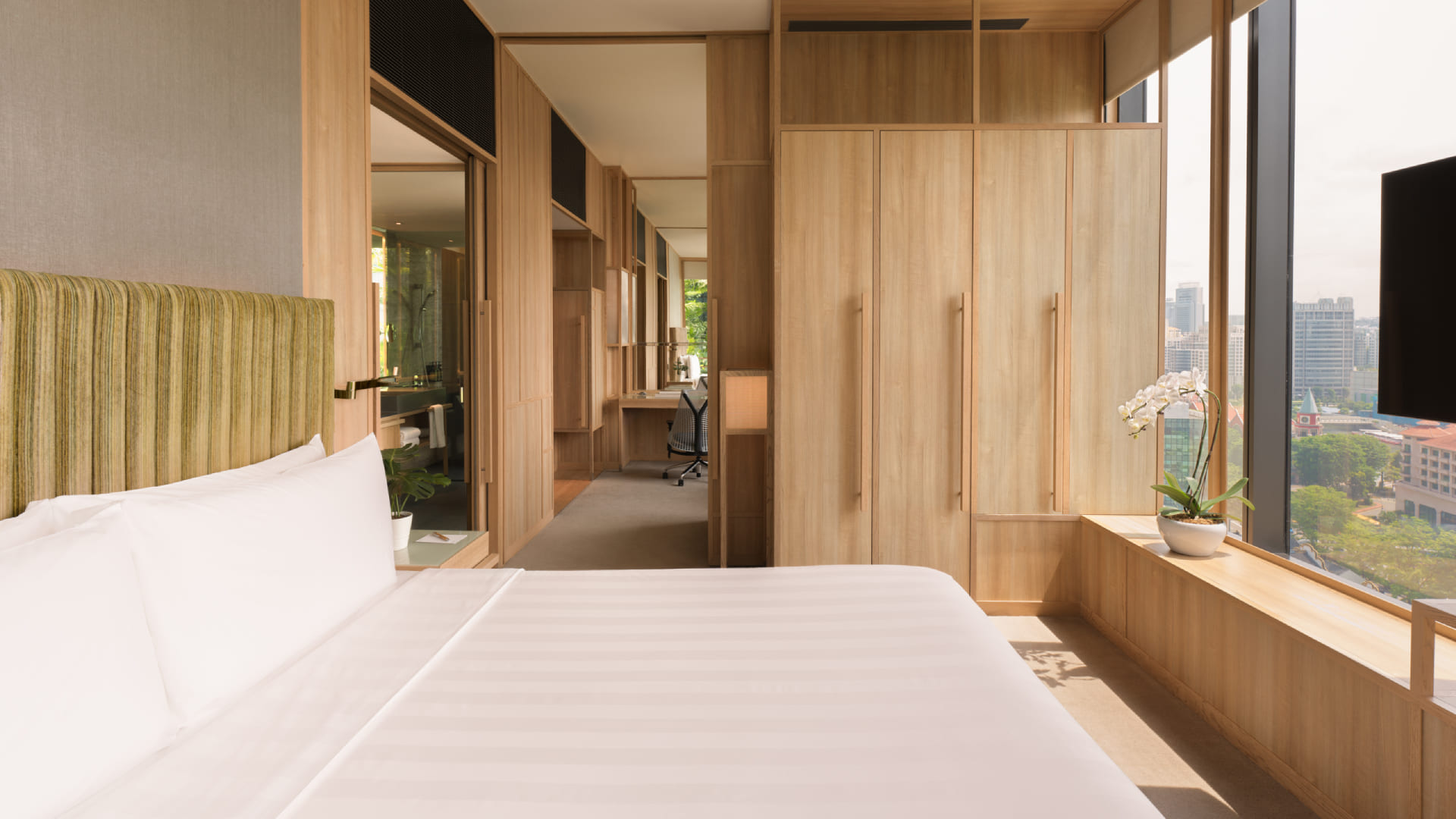酒店客房与套房的设计灵感源于自然,采光充足,旨在为您打造一处静谧舒适的休憩之所。在舒适的客房内,您可以欣赏滨海湾和克拉码头的壮丽景色。房间采用天然木质装饰、落地窗、可生物降解的用品和高级过滤饮水机,减少一次性塑料瓶的使用,打造环保奢华的生活方式。